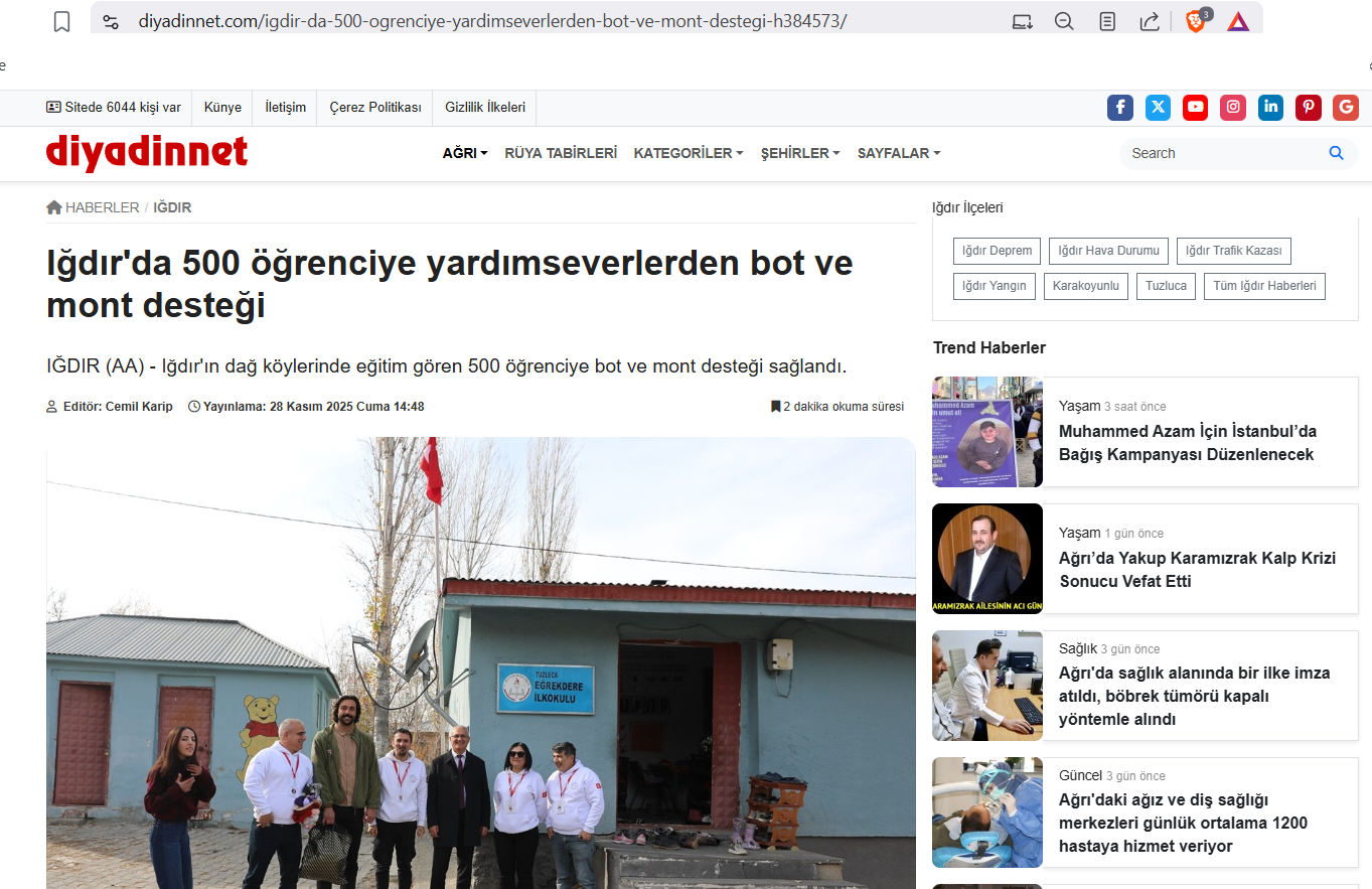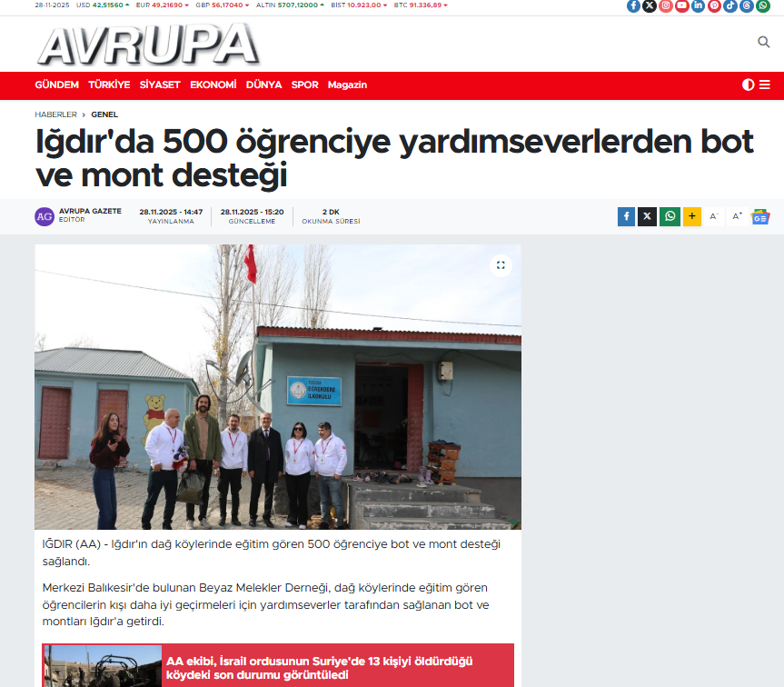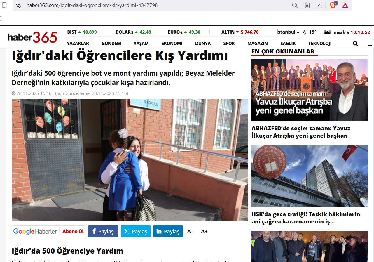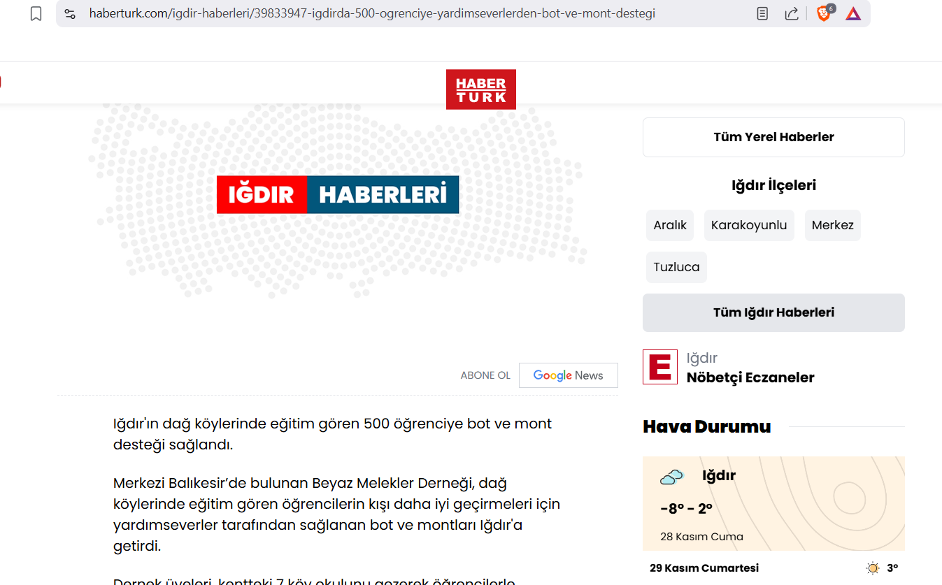 Beyaz Melekler Derneği olarak, Iğdır'ın köy okullarında öğrenim gören yüzlerce çocuğumuza kış aylarında sıcaklık ve destek sunmak amacıyla gerçekleştirdiğimiz Bot ve Mont Yardım Kampanyası, ulusal basında geniş yankı buldu!